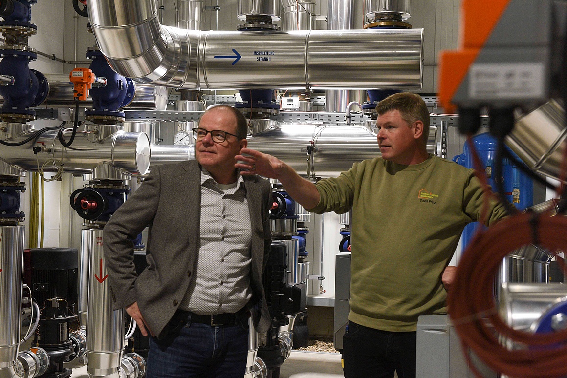 Gemeinsam mit Thomas Rauf, der bei der HpH u.a. für Immobilien und Haustechnik zuständig ist, ließ Guido Uhl sich bei einem Vor-Ort-Termin in der Energiezentrale Badbergen die Technik der Fernwärmeversorgung zeigen. Jochen Nietfeld und David Prinz, gemeinsame Geschäftsführer der Energiewende Badbergen (EWB), erklärten die technischen Hintergründe und die Vorteile der Fernwärmeversorgung.