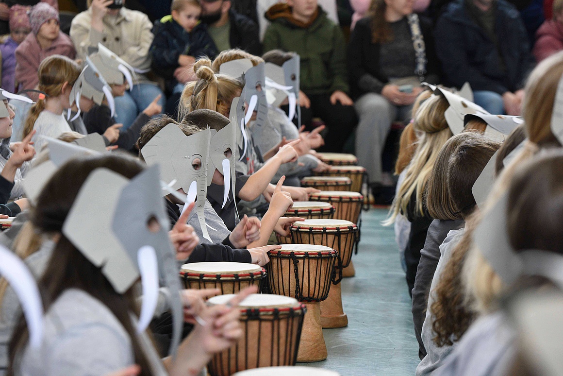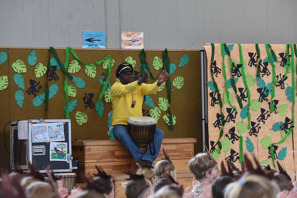 Eine Woche lang drehte sich alles um Trommeln, Singen und Tanzen. Angeleitet wurden die Kinder vom erfahrenen Trommler Fofo, der sie mit viel Begeisterung in die Welt der afrikanischen Rhythmen einführte. Gemeinsam tauchten die Schüler*innen in die Geschichte des Trommelzauberlandes Tamborena ein. In dieser Fantasiewelt begegneten sie Elefanten, Gazellen, Giraffen und Affen – Tiere, die sie mit Trommelrhythmen, Liedern und Tänzen lebendig werden ließen.