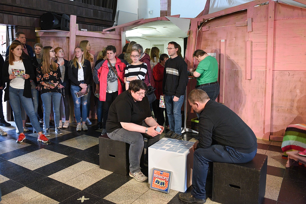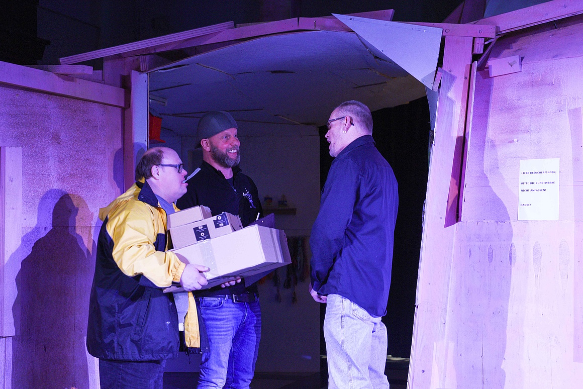 In der kreativen Umgebung des Bramscher Bahnhofs bauen die elf Glücksritter „ihr Lager“ auf und richten alles so her, wie sie es benötigen. Dafür schieben sie Gestelle mit schwarzen Vorhängen an ihre Plätze, packen Requisiten aus und stellen Wasserflaschen für die Pause bereit. Kurz: Sie verwandeln die Bahnhofshalle in einen Probenraum.