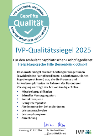 Das Qualitätssiegel zeichnet Leistungserbringer:innen (psychiatrische Fachpflegedienste, Soziotherapeut:innen, Ergotherapeut:innen) aus, die die Prozesse und Anforderungskriterien im Rahmen der Besonderen Versorgungsverträge der IVP vollständig erfüllen.